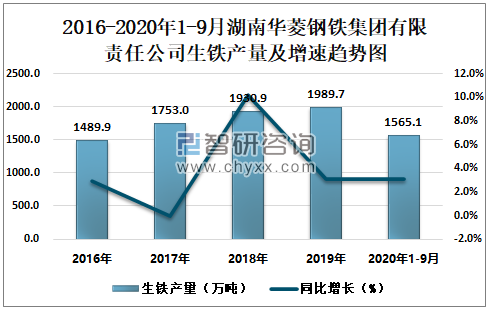 2016-2020年1-9月湖南华菱钢铁集团有限责任公司生铁产量及增速趋势图