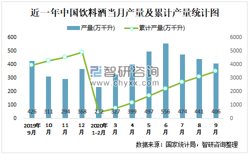 根据国家统计局数据显示:2020年9月中国饮料酒产量为406万千升,同比下降1.63%;2020年1-9月中国饮料酒累计产量为3509.7万千升,同比下降7.73%;2015-2019年中国饮料酒产量2015年达到最高,此后逐年递减。