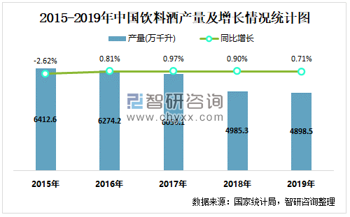 2015-2019年中国饮料酒产量及增长情况统计图