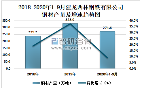 2018-2020年1-9月建龙西林钢铁有限公司钢材产量及增速趋势图