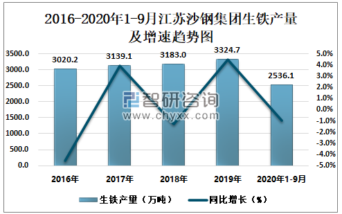 2016-2020年1-9月江苏沙钢集团生铁产量及增速趋势图