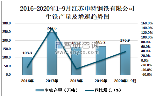 2016-2020年1-9月江苏申特钢铁有限公司生铁产量及增速趋势图