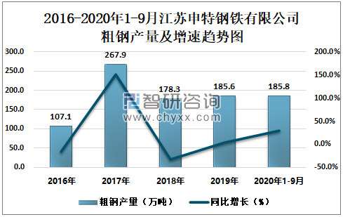 根据冶金工业信息中心数据显示:2020年1-9月江苏申特钢铁有限公司钢材产量为189.9万吨,同比增长33.4%;粗钢产量为185.8万吨,同比增长29.4%;生铁产量为176.9万吨,同比增长39.2%。