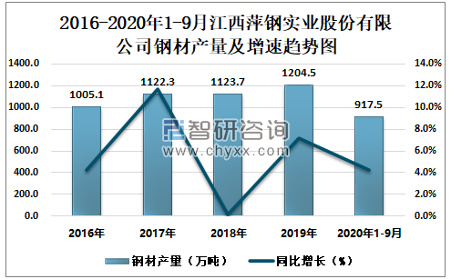 2016-2020年1-9月江西萍钢实业股份有限公司钢材产量及增速趋势图