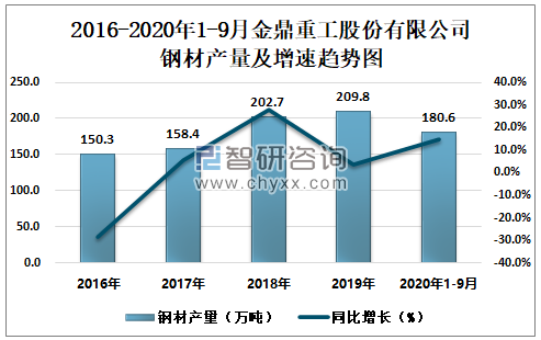 2016-2020年1-9月金鼎重工股份有限公司钢材产量及增速趋势图