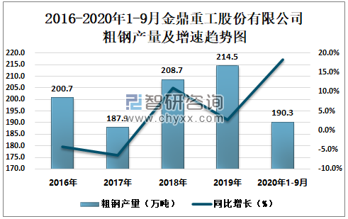 2016-2020年1-9月金鼎重工股份有限公司粗钢产量及增速趋势图