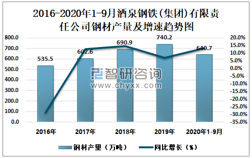 根据冶金工业信息中心数据显示:2020年1-9月酒泉钢铁(集团)有限责任公司钢材产量为640.7万吨,同比增长13.5%;粗钢产量为623.8万吨,同比增长8.6%;生铁产量为530.4万吨,同比增长9.7%。