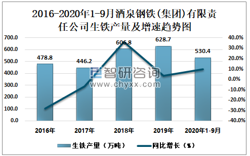 2016-2020年1-9月酒泉钢铁(集团)有限责任公司生铁产量及增速趋势图