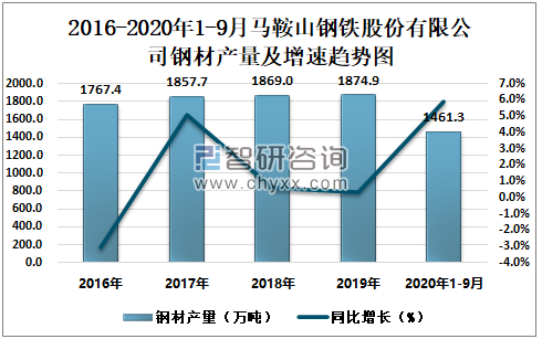 2016-2020年1-9月马鞍山钢铁股份有限公司钢材产量及增速趋势图