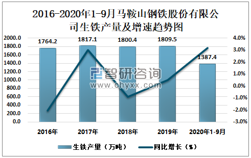 2016-2020年1-9月马鞍山钢铁股份有限公司生铁产量及增速趋势图