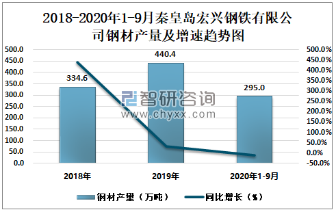 2018-2020年1-9月秦皇岛宏兴钢铁有限公司钢材产量及增速趋势图