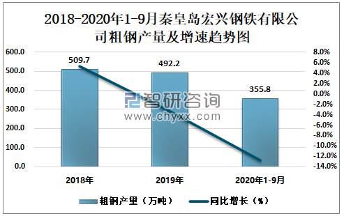 根据冶金工业信息中心数据显示:2020年1-9月秦皇岛宏兴钢铁有限公司钢材产量为295.0万吨,同比下降11.9%;粗钢产量为355.8万吨,同比下降12.8%;生铁产量为302.0万吨,同比下降6.6%。