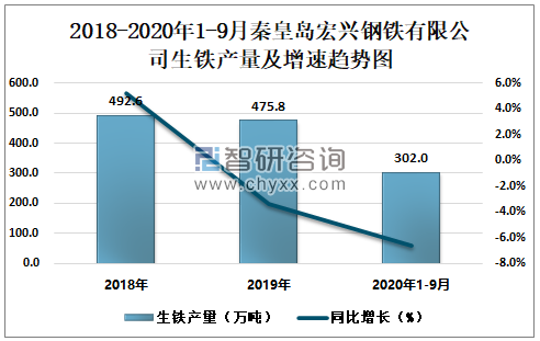 2018-2020年1-9月秦皇岛宏兴钢铁有限公司生铁产量及增速趋势图