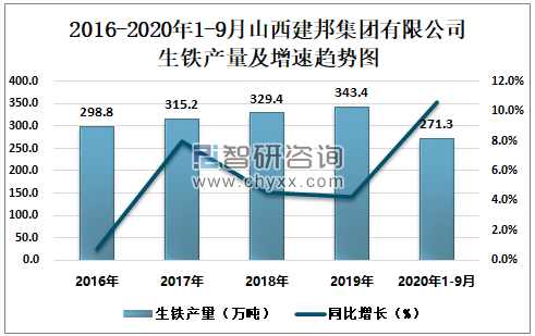 2016-2020年1-9月山西建邦集团有限公司生铁产量及增速趋势图
