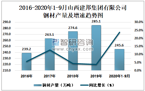 2016-2020年1-9月山西建邦集团有限公司钢材产量及增速趋势图