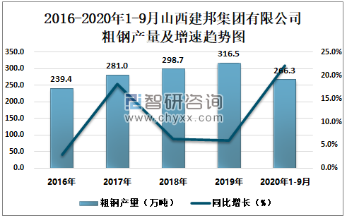 根据冶金工业信息中心数据显示:2020年1-9月山西建邦集团有限公司钢材产量为245.6万吨,同比增长23.9%;粗钢产量为266.3万吨,同比增长22.0%;生铁产量为271.3万吨,同比增长10.6%。