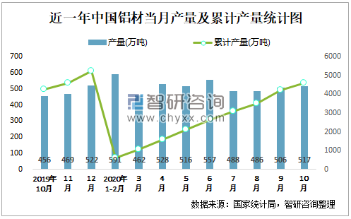 近一年中国铝材当月产量及累计产量统计图