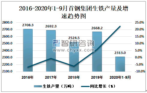 2016-2020年1-9月首钢集团生铁产量及增速趋势图