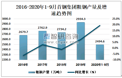 2016-2020年1-9月首钢集团粗钢产量及增速趋势图