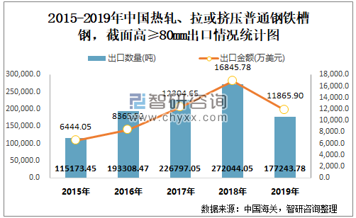 2015-2019年中国热轧、拉或挤压普通钢铁槽钢,截面高≥80MM出口情况统计图