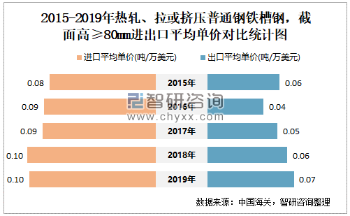2015-2019年中国热轧、拉或挤压普通钢铁槽钢,截面高≥80MM进出口平均单价对比统计图