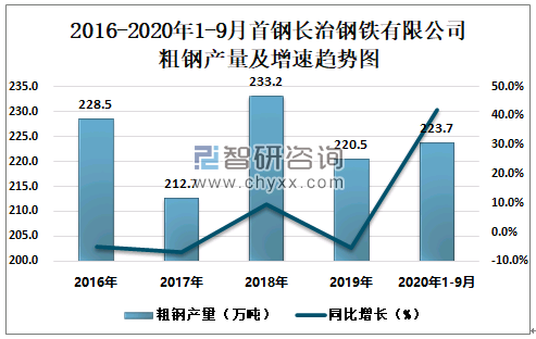 2016-2020年1-9月首钢长治钢铁有限公司粗钢产量及增速趋势图