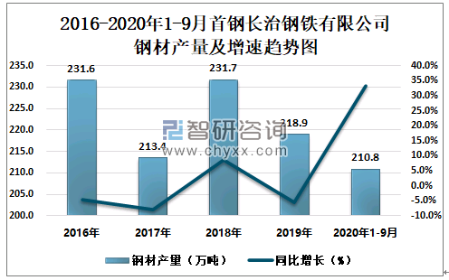 根据冶金工业信息中心数据显示:2020年1-9月首钢长治钢铁有限公司钢材产量为210.8万吨,同比增长33.2%;粗钢产量为223.7万吨,同比增长41.9%;生铁产量为191.3万吨,同比增长43.5%。
