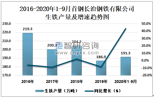 2016-2020年1-9月首钢长治钢铁有限公司生铁产量及增速趋势图