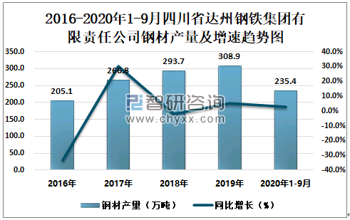 2016-2020年1-9月四川省达州钢铁集团有限责任公司钢材产量及增速趋势图