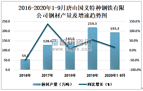 2016-2020年1-9月唐山国义特种钢铁有限公司钢材产量及增速趋势图