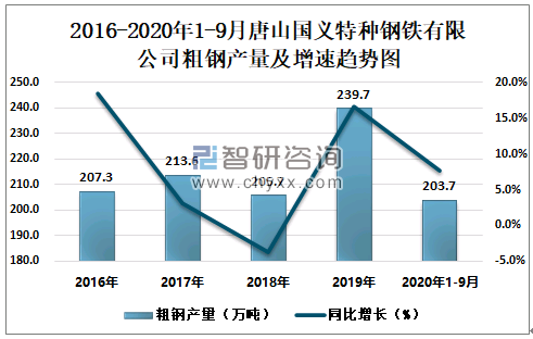 2016-2020年1-9月唐山国义特种钢铁有限公司粗钢产量及增速趋势图