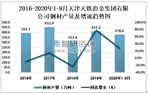 2016-2020年1-9月天津天铁冶金集团有限公司钢材产量及增速趋势图