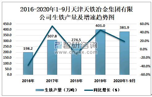 2016-2020年1-9月天津天铁冶金集团有限公司生铁产量及增速趋势图