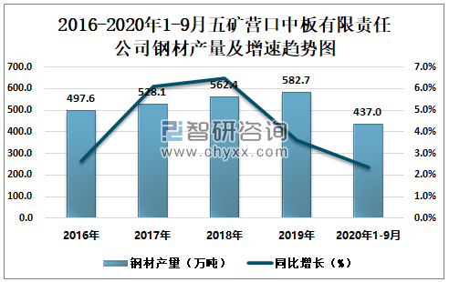 2016-2020年1-9月五矿营口中板有限责任公司钢材产量及增速趋势图