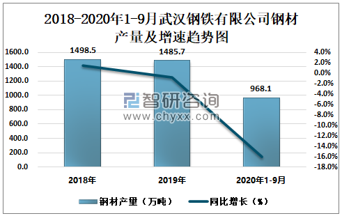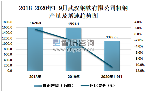 根据冶金工业信息中心数据显示:2020年1-9月武汉钢铁有限公司钢材产量为968.1万吨,同比下降16.1%;粗钢产量为1106.5万吨,同比下降10.7%;生铁产量为1051.7万吨,同比下降12.9%。