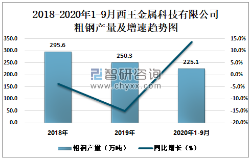 2018-2020年1-9月西王金属科技有限公司粗钢产量及增速趋势图