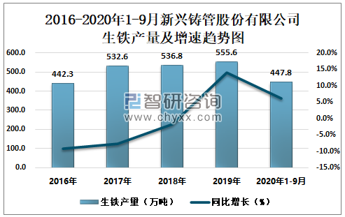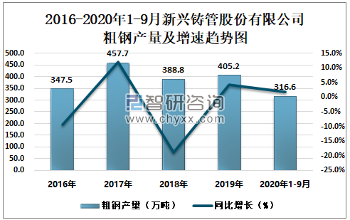 根据冶金工业信息中心数据显示:2020年1-9月新兴铸管股份有限公司钢材产量为333.8万吨,同比增长6.8%;粗钢产量为316.6万吨,同比增长1.8%;生铁产量为447.8万吨,同比增长6.1%。