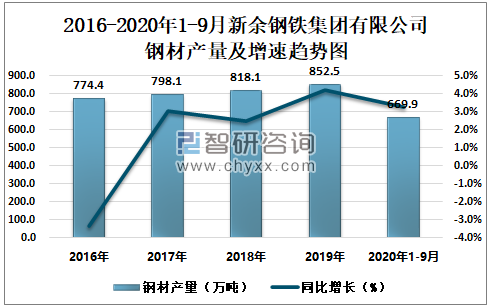 2016-2020年1-9月新余钢铁集团有限公司钢材产量及增速趋势图