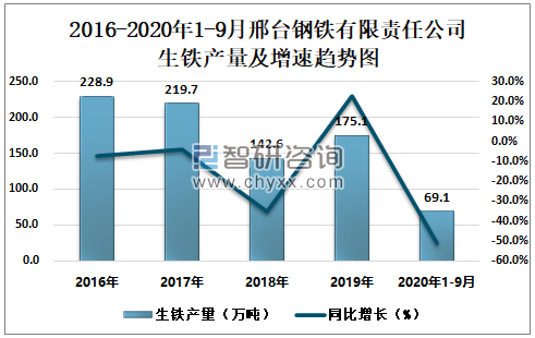 2016-2020年1-9月邢台钢铁有限责任公司生铁产量及增速趋势图