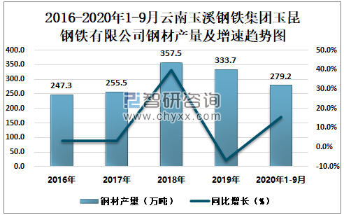2016-2020年1-9月云南玉溪钢铁集团玉昆钢铁有限公司钢材产量及增速趋势图