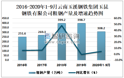 2016-2020年1-9月云南玉溪钢铁集团玉昆钢铁有限公司粗钢产量及增速趋势图