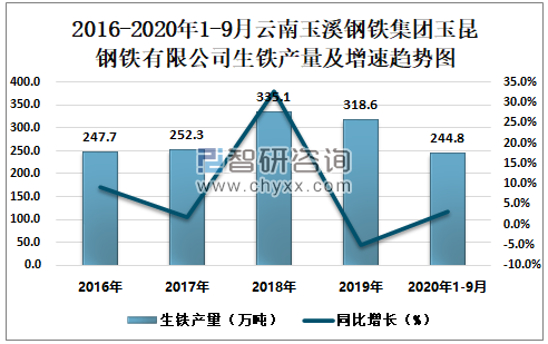 2016-2020年1-9月云南玉溪钢铁集团玉昆钢铁有限公司生铁产量及增速趋势图