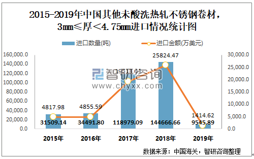 根据中国海关数据显示:2015-2019年中国其他未酸洗热轧不锈钢卷材,3mm≤厚<4.75mm进口数量与进口金额至2018年后呈现快速下滑趋势;2015-2019年中国其他未酸洗热轧不锈钢卷材,3mm≤厚<4.75mm出口金额近3年逐年递减。