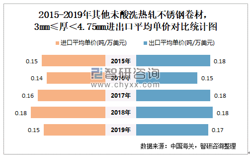 2015-2019年中国其他未酸洗热轧不锈钢卷材,3MM≤厚<4.75MM进出口平均单价对比统计图