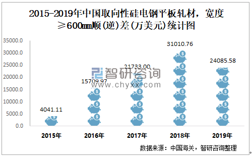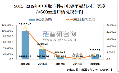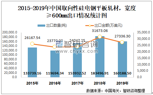 根据中国海关数据显示:2019年1-12月中国取向性硅电钢平板轧材,宽度≥600mm进口数量为20260.37吨,进口金额为3250.72万美元;2019年1-12月取向性硅电钢平板轧材,宽度≥600mm出口数量为160188.5吨,出口金额为27336.3万美元。