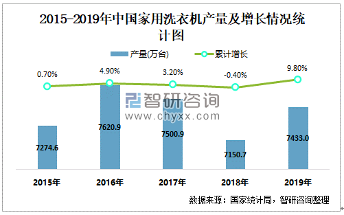 2015-2019年中国家用洗衣机产量及增长情况统计图