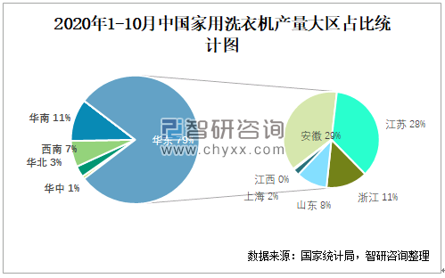 2020年1-10月中国家用洗衣机产量大区占比统计图