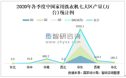 2020年各季度中国家用洗衣机七大区产量统计图