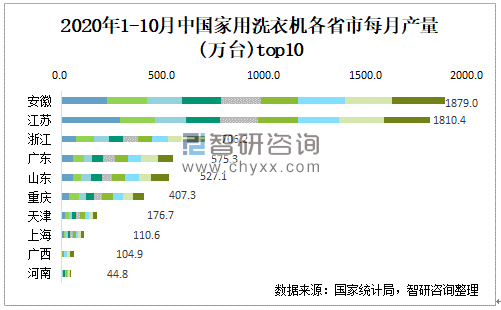 2020年1-10月中国家用洗衣机各省市每月产量top10