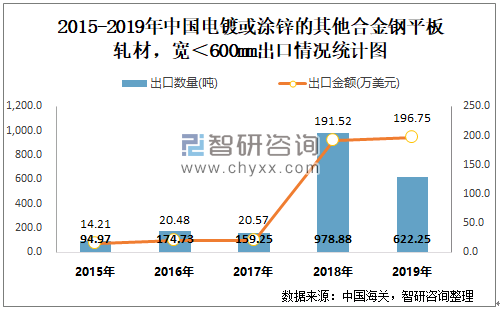 根据中国海关数据显示:2019年1-12月中国电镀或涂锌的其他合金钢平板轧材,宽<600mm进口数量为4220.33吨,进口金额为531.39万美元;2019年1-12月电镀或涂锌的其他合金钢平板轧材,宽<600mm出口数量为622.25吨,出口金额为196.75万美元。